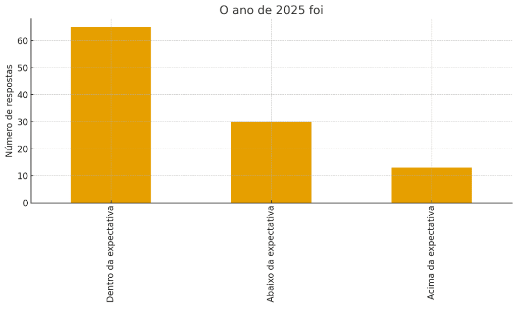 Quando perguntados sobre o desempenho de 2025, a maioria dos respondentes classificou o ano como “dentro da expectativa”, enquanto uma parcela relevante percebeu resultados “abaixo da expectativa” e uma minoria avaliou o período como “acima da expectativa”. Ou seja, foi um ano em que o setor entregou, mas à custa de muita disciplina de custos e ajustes operacionais.