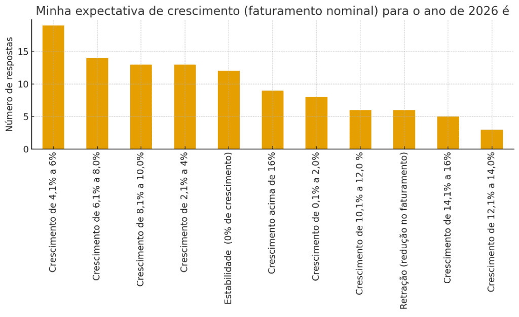 Para 2026, o Índice mostra um otimismo moderado. A maior parte dos respondentes projeta crescimento nominal de faturamento em faixas intermediárias — algo em torno de alguns pontos percentuais ao ano —, com poucos extremos de forte retração ou euforia. Na prática, o setor pretende crescer acima do PIB, mas sem apostar em “boom” de demanda.